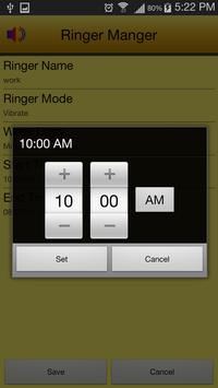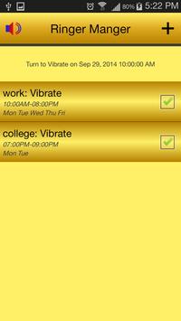 Ringer Manager is a simple to use and an effective application to control the ringer on your phone. With Ringer Manager you pre-set the weekdays and time at which your phone's ringer goes into a certain mode (Normal, Vibrate or Silent) and you can then just forget about your phone's ringer.