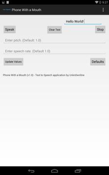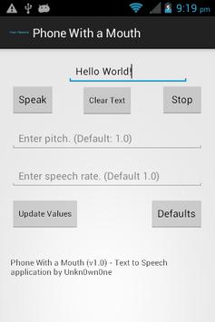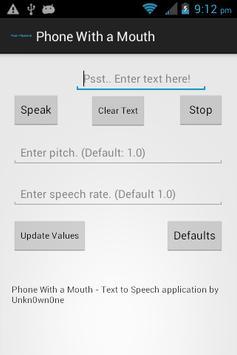 Phone With a Mouth is a text to speech (TTS) client. It allows you to enter text and have your phone speak it to you.