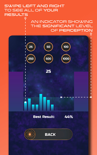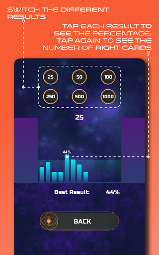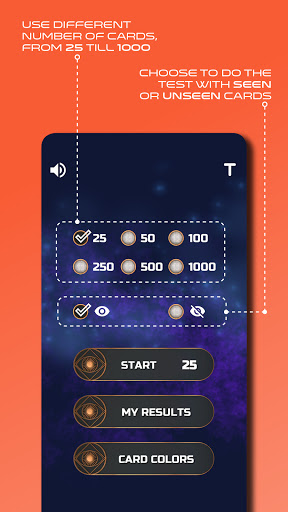 •เลือกที่จะใช้จำนวนการ์ดที่แตกต่างกันตั้งแต่ 25 ถึง 1,000 การ์ดที่คุณใช้มากเท่าใดผลลัพธ์ที่คุณแม่นยำยิ่งขึ้นเท่านั้น > •เลือกที่จะทำการทดสอบกับการ์ดที่เห็นหรือมองไม่เห็นสำหรับผลลัพธ์ที่รับรู้มากขึ้น
