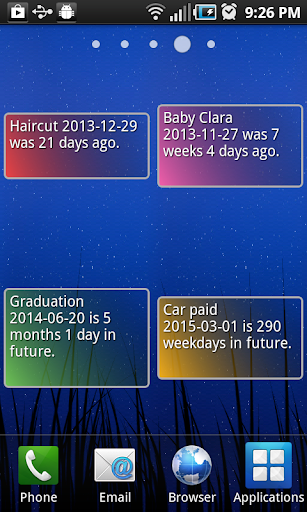 คุณสามารถดูวันในจำนวนปีเดือนและวันวันธรรมดาจำนวนสัปดาห์หรือเพียงแค่จำนวนวันฟรีมีวิดเจ็ตด้วยรุ่นนี้มีอินเทอร์เฟซใหม่ที่สดใหม่สำหรับอุปกรณ์ที่ใหม่กว่าและความสามารถในการค้นหาฟรีและไม่มีโฆษณา!