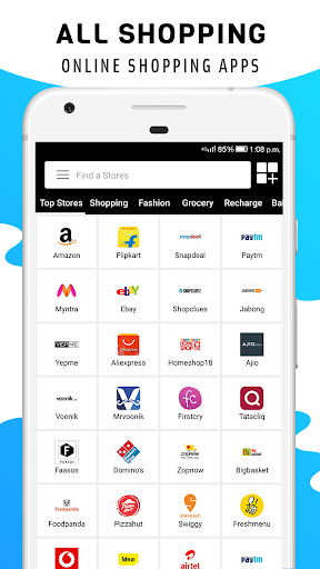 Some of the major categories listed in this All In One App Shopping App are Baby & Kids Products, Recharge, Grocery, Electronics , Fashion (Clothing), With all in one shopping app you can avail discounts Get Coupons on Myntra, flipkart, Amazon, firstcry. Earn Rewards, Redeem Cashback, Find the best deals and much more with your this All In One App Shopping App.