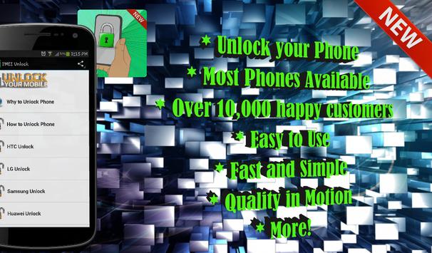 IMEI unlocking is the simplest way to unlock your phone. The IMEI number is a unique 15-digit identification number for your phone, which is displayed when you press *#06# on your phone's keypad. The IMEI is also printed on the back of your phone, usually underneath the battery.