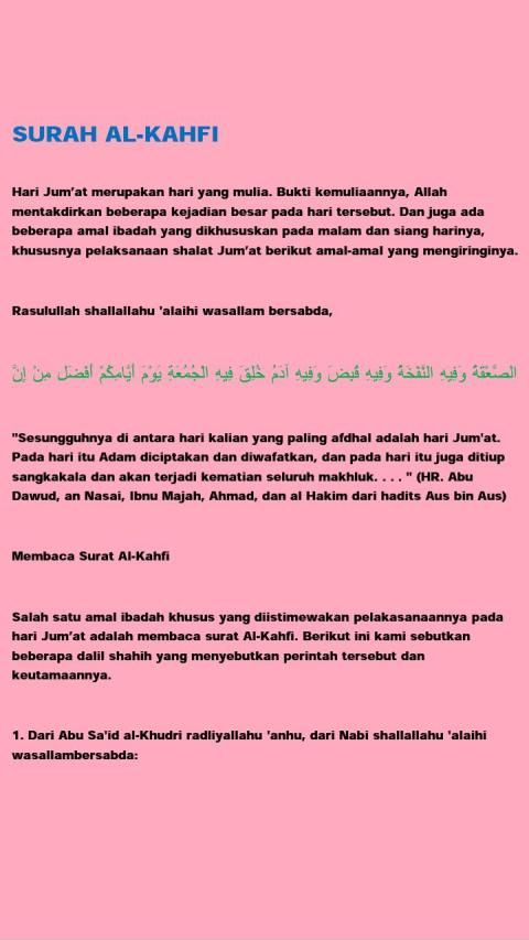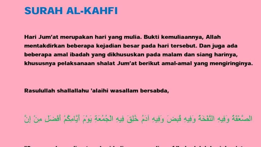 “Barangsiapa yang membaca surat Al Kahfi pada hari Jum’at, dia akan disinari cahaya di antara dua Jum’at.” (HR. An Nasa’i dan Baihaqi. Syaikh Al Albani mengatakan bahwa hadits ini shohih sebagaimana dalam Shohihul Jami’ no. 6470)
