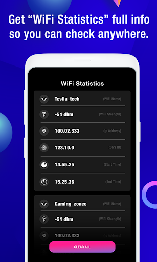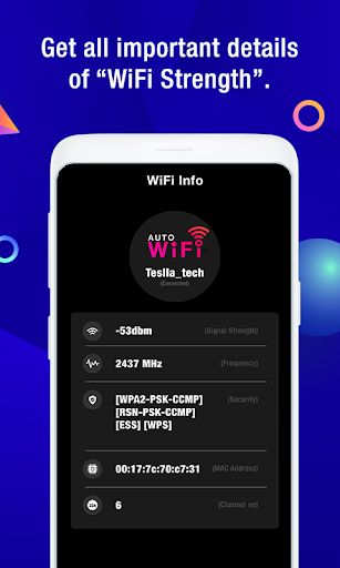 พร้อมด้วย WiFi อัตโนมัติยังได้รับรายละเอียดทั้งหมดของ WiFi รายละเอียดเช่น - ชื่อ WiFi, ความแรงของสัญญาณ, ความถี่ไร้สาย, การรักษาความปลอดภัย WiFi, ที่อยู่ MAC, ช่องหมายเลข ฯลฯ และรับการเชื่อมต่อ WiFi และประสิทธิภาพในรูปแบบสถิติ