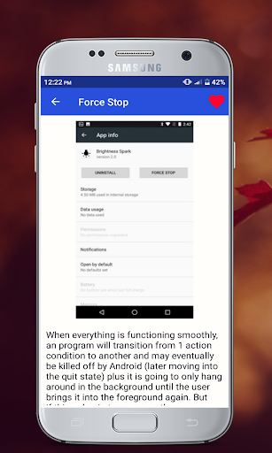 คำแนะนำสำหรับ Force Stop โดยอัตโนมัติ - แอพนี้แนะนำวิธีการบังคับให้หยุดโดยอัตโนมัติคุณโทรศัพท์บางครั้งเราไม่ต้องการให้พวกเขาทำงานเพราะเราเกลียดการแจ้งเตือนที่น่ารำคาญเหล่านั้นแอปนี้ไม่เพียง แต่จะช่วยคุณและเทคนิคบางอย่างหยุดและทำให้โทรศัพท์ของคุณเร็วขึ้นและมีประสิทธิภาพมากขึ้น! ดาวน์โหลดเดี๋ยวนี้และเพลิดเพลินกับโทรศัพท์ที่สวยงามของคุณอีกครั้ง