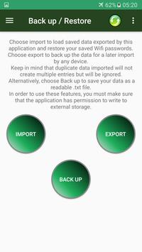 Import saved passwords : restore old passwords backed up by this app. If the same network is already saved, entry will not be duplicated or overwritten, as it is considered older. So import any old save without worry!