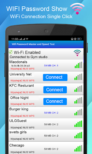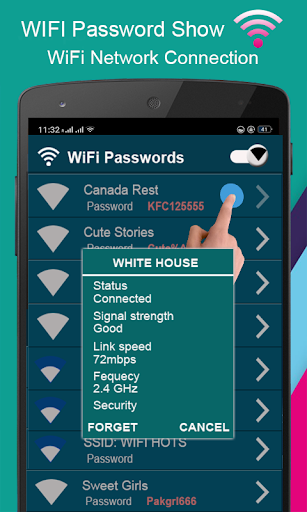 Wifi Password show and Wifi Analyzer may be a useful WiFi tool to research and optimize your WiFi networks. Check signal strength and find the simplest place where no interference found. This Wifi network analyzer helps to decrease interference and increase connection speed and stability. Graph Access Point signal strength over time.WiFi band, Signal strength, Security and SSID