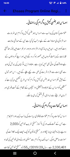 โปรแกรม EHSAAS ออนไลน์ลงทะเบียนเป็นแอปพลิเคชันที่สามารถแนะนำผู้คนให้เข้าใจโปรแกรม EHSAAS และกระบวนการ IMDAD สำหรับ คนส่วนใหญ่ไม่รู้วิธีเก็บเงินสำหรับคาฟารัต เพื่อให้ง่ายขึ้นสำหรับผู้คนแอปพลิเคชันการลงทะเบียนออนไลน์ของโปรแกรม EHSAAS นี้จะช่วยให้พวกเขาเข้าใจวิธีการเก็บเงินสำหรับผู้หญิงที่มีค่าในปากีสถาน นี่คือค่าเผื่อ 21,000 รูปีในกรณีฉุกเฉิน สิ่งนี้ทำให้ชีวิตของครอบครัวยากจนง่ายขึ้น คนส่วนใหญ่ไม่รู้ว่าเงินสดมาถึงหรือไม่ หนึ่งสามารถค้นหาคุณสมบัติ IMDAD ของพวกเขาในแอปพลิเคชันการลงทะเบียนออนไลน์ของโปรแกรม EHSAAS ผ่านหมายเลข CNIC ของพวกเขา หากพวกเขามีสิทธิ์ได้รับ Kafalat พวกเขาจะได้รับข้อความในหน้าระบุว่ามีสิทธิ์ หากพวกเขาไม่มีสิทธิ์ได้รับ IMDAD ข้อความของพวกเขาจะปรากฏบนหน้า