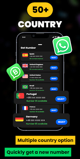Virtual Number allows you to easily get a second phone number from over 60 countries, including dedicated US and UK numbers for WhatsApp and WA Business.