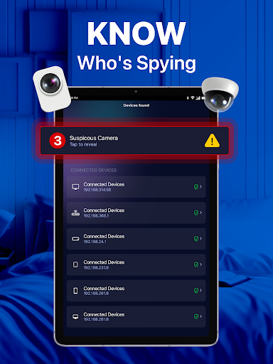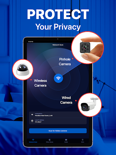 - การสแกนเครือข่าย: ระบุอุปกรณ์ที่เชื่อมต่อบนเครือข่าย Wi-Fi ของคุณช่วยให้คุณค้นพบกล้องที่ไม่ได้รับอนุญาตรักษาความเป็นส่วนตัวของคุณไว้ในสถานที่ต่าง ๆ เช่นโรงแรมห้องนอนและสำนักงานด้วยการสแกนเครือข่าย