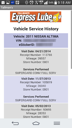 The eSticker app also lets you view a history of all services performed on your vehicles by Tallman's Express Lube at any time, so you'll always know which services have been performed on each of your vehicles, and when they were last performed.