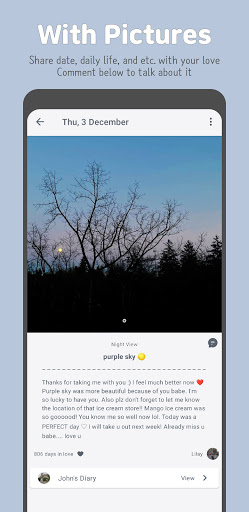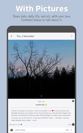 เมื่อคุณและคู่ของคุณทำไดอารี่ให้เสร็จนับหัวใจของคุณจะเพิ่มขึ้น 1. คุณสามารถตรวจสอบการนับหัวใจทั้งหมดที่หน้าจอหลัก หากความรักของคุณไม่ได้เขียนไดอารี่วันนี้คุณสามารถเตือนความรักของคุณได้โดยคลิกที่ปุ่ม "เตือน" เพิ่มรูปภาพเพื่อให้ภาพที่สดใสของวันของคุณกับ BF / GF ของคุณ คุณสามารถสื่อสารกับครึ่งสำคัญของคุณโดยความคิดเห็น ทำให้ luvdiary ของคุณเต็มไปด้วยความทรงจำเกี่ยวกับความสัมพันธ์กับไดอารี่