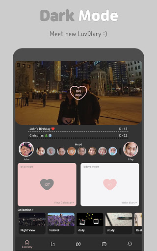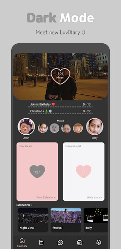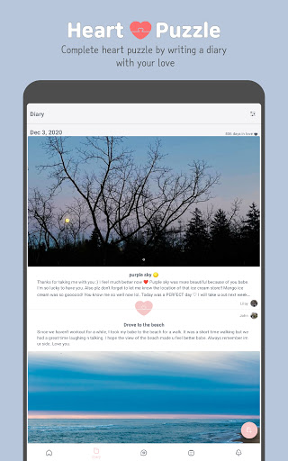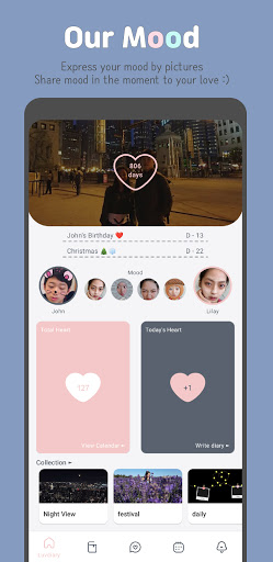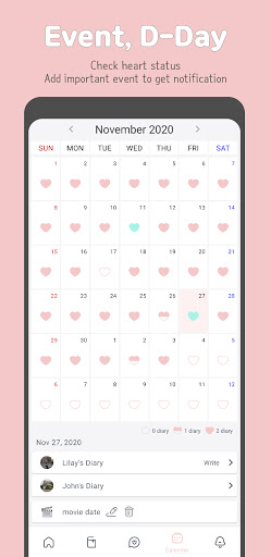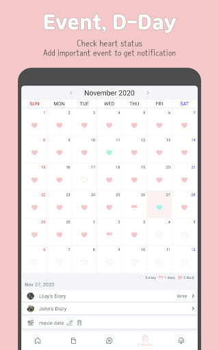 ดูว่าหัวใจของคุณเป็นอย่างไรในแต่ละเดือน หัวใจจะว่างเปล่าครึ่งหนึ่งหรือเต็มขึ้นอยู่กับไดอารี่ของคุณ เหตุการณ์สำคัญจะปรากฏขึ้นและคุณสามารถเพิ่มใหม่ เลือกสติกเกอร์ที่พอดีกับเหตุการณ์ หัวใจจะเป็นสีมิ้นต์ในวันที่มีเหตุการณ์ใด ๆ สองวันที่กำลังจะมาถึง D-Days อยู่บนหน้าจอหลักเช่นกัน เตือนตัวเองสำหรับวันครบรอบและกิจกรรมต่าง ๆ ด้วยความรักของคุณ