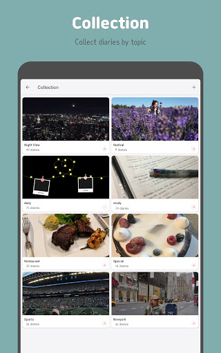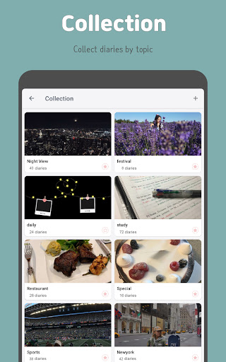 คุณสามารถรวบรวมไดอารี่ตามหัวข้อ คอลเลกชันที่ชื่นชอบจะปรากฏที่ด้านล่างของหน้าจอหลัก