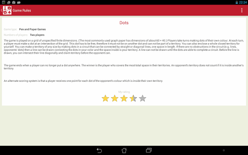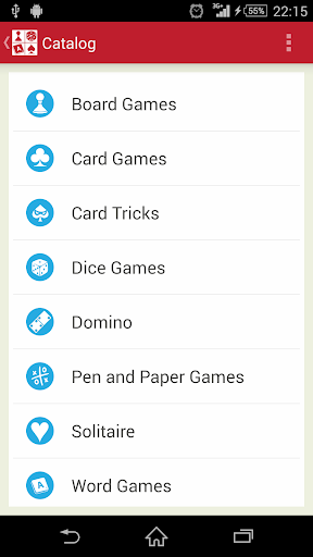 คำอธิบายและกฎของเกมมากกว่า 110 เกมที่มีความสามารถในการค้นหาและการให้คะแนนที่สะดวกแคตตาล็อกมีส่วนต่อไปนี้ของเกมดังต่อไปนี้: เกมคำศัพท์, เกมลูกเต๋า, เกมไพ่, เทคนิคการใช้บัตร, Solitaire, Domino, Pen และเกมกระดาษเกมกระดานการค้นหาช่วยให้คุณรับเกมสำหรับผู้คนจำนวนหนึ่ง