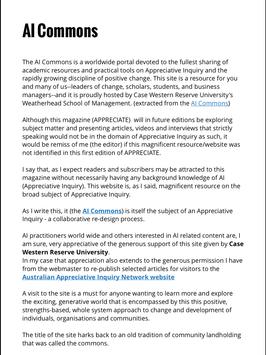 Whilst each edition will contain or feature articles and case studies of successful applications of the philosophy and process called Appreciative Inquiry, it will also include various other strengths-based and/or positive focused approaches to change and improvement stories.