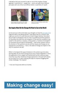 We will do this in the belief, grounded in solid scientific studies, that discussing "good news" is not merely enjoyable but actually has the effect of enlarging our "thought/action repertoire". (Thank you Barbara Fredrickson for your book, Positivity, and all the research and papers. All your work makes it clear that the easiest way to enhance or develop solid working relationships AND our creative capacities is to create an environment in which people can experience positive emotions.