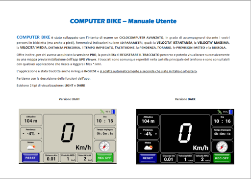 จักรยานคอมพิวเตอร์ได้รับการพัฒนาด้วยความตั้งใจที่จะเป็น Potocomputer วงจรขั้นสูงสามารถไปกับคุณในระหว่างเส้นทางจักรยานของคุณ (แต่ยังเดินเท้า) ให้คำแนะนำเกี่ยวกับ 10 พารามิเตอร์เช่น: ความเร็วทันทีความเร็วสูงสุดความเร็วสูงสุด ระยะทางเดินทางเวลาที่ใช้ความสูงความลาดชันเวลาพยากรณ์อากาศและบัสโซล่านอกจากนี้ยังมีข้อเสนอสำหรับผู้ที่ซื้อรุ่น Pro ความเป็นไปได้ในการลงทะเบียนเส้นทางการติดตามและสามารถ ดูในภายหลังบนแผนที่เมื่อติดตั้งแอป GPX Viewerอย่างไรก็ตามแทร็กนั้นมีอยู่ในโฟลเดอร์หลักของโทรศัพท์และสามารถให้คำปรึกษากับแอปพลิเคชันใด ๆ ที่คุณสามารถอ่าน * .kml ไฟล์