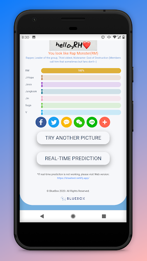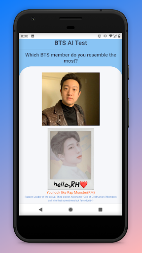 การทดสอบ BTS AI เป็นแอปพลิเคชั่นที่จะทำนายใบหน้าของคุณที่ตรงกับหนึ่งในสมาชิก BTS AI. อัลกอริทึมการเรียนรู้เครื่องใช้สำหรับแอปพลิเคชันนี้ มีการใช้มากกว่า 300 ภาพสำหรับสมาชิกแต่ละคน ดังนั้นภาพรวม 2500 ภาพโดยประมาณที่ใช้สำหรับ A.I รูปแบบการเรียนรู้เครื่อง ดังนั้นความแม่นยำของการทำนายจึงสูงมาก คุณสามารถคาดการณ์ว่าใครเป็นสมาชิก BTS ที่มีลักษณะคล้ายกับคุณมากที่สุด นอกจากนี้คุณจะได้เรียนรู้ BTS กับคำอธิบายสมาชิก อย่ารอช้าที่จะพบกับ R.M. , Suga, Jimin, Jin, Jungkook, V และ J-Hope
