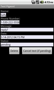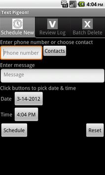 Have you ever wanted to text someone at a later time? But it might not be convenient or you might forget about it later. Let Text Pigeon! schedule it for you now. Just enter the phone number, message, and the time to send it. Note Text Pigeon! uses the text messaging service (a.k.a. SMS) on your phone. Standard text messaging rates apply.