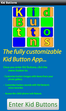 Kids love pushing buttons! Customize over 100 buttons on this toy app with images from your photo gallery, and record a different sound for each button. This fun toy app includes a child phone lock. Kid Buttons is designed for kids, toddlers, and infants. All buttons are completely customizable. Not only can different images be downloaded for each button, parents can also record a different sound for each button, download a sound or music file for each button, or just stick with the default button tones. This play app comes with a child phone lock, which parents can easily set to ensure kids do not disturb other aspects of the device. With zero advertisements, Kid Buttons is guaranteed to provide hours of entertainment for your child.