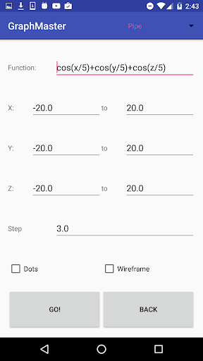 กราฟหลักเป็นเครื่องมือพล็อตสมการสามมิติที่ออกแบบโดยคำนึงถึงความเรียบง่าย โทนสีสีพาสเทลได้รับเลือกเพื่อความงามและความคมชัดเพื่อให้ตรงกับความสง่างามตามธรรมชาติของคณิตศาสตร์ในรูปแบบที่บริสุทธิ์ที่สุด เลย์เอาต์ได้รับการออกแบบให้ใช้งานง่ายและเข้าใจง่ายสำหรับผู้คนในภูมิหลังทางคณิตศาสตร์ทั้งหมด นอกจากนี้ Graph Master ยังไม่มีโฆษณาและจะไม่มีบริการชำระเงิน สามารถพล็อตฟังก์ชั่นที่ชัดเจนโดยนัยและพารามิเตอร์เป็นระดับความแม่นยำใด ๆ ที่ระบุภายในข้อ จำกัด ของฮาร์ดแวร์ นอกจากนี้ยังมีวิธีการสร้างภาพที่แตกต่างกันหลายวิธีรวมถึงการเติมเฟรมลวดและจุดตามที่สามารถสังเกตได้ในภาพตัวอย่าง โดเมนของแต่ละฟังก์ชั่นสามารถระบุได้สำหรับสมการทุกประเภท ฟังก์ชั่นทางคณิตศาสตร์ส่วนใหญ่จะรวมอยู่ใน Parser สามารถดูรายการที่สมบูรณ์ได้ด้านล่าง แอพนี้ยังมาพร้อมกับฟังก์ชั่นที่ตั้งไว้ล่วงหน้าที่เลือกไว้มือเพื่อสร้างแรงบันดาลใจให้ผู้ใช้ปรับเปลี่ยนและสร้างพื้นผิวที่เป็นเอกลักษณ์ของตัวเอง รายการของฟังก์ชั่นที่ตั้งไว้ล่วงหน้าทั้งหมดมีอยู่ด้านล่าง