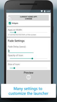 Every part of this launcher is customizable. You can set the size of the icon, drawer, the fade of the drawer, the delay before the icon fades and more.
