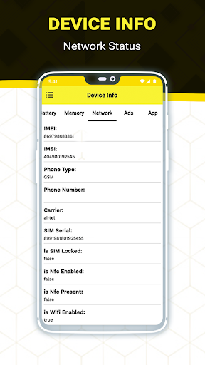 Network: SIM Serial, Is SIM locked, is WIFI Enabled, is Network available, Network Type.