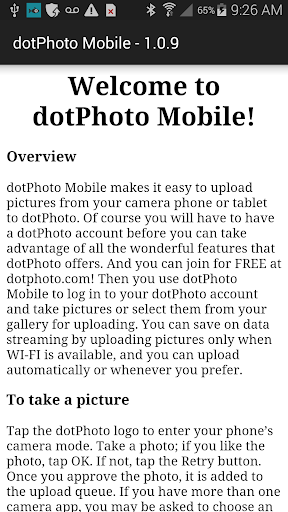 dotPhoto Mobile makes it easy to upload pictures from your camera, phone or tablet to dotPhoto. Of course you will have to have a dotPhoto account before you can take advantage of all the wonderful features that dotPhoto offers. And you can join for FREE at dotphoto.com! Then you use dotPhoto Mobile to log in to your dotPhoto account and take pictures or select them from your gallery for uploading. You can save on data streaming by uploading pictures only when WI-FI is available, and you can upload automatically or whenever you prefer.