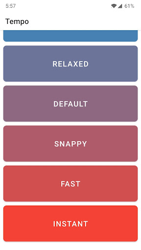 Tempo Curates ความเร็วที่น่าพอใจที่สุดในการใช้งานรวมถึงช้าผ่อนคลายค่าเริ่มต้นSnappy และทันทีเลือกระหว่างความเร็วในการโต้ตอบและแอปพลิเคชันเปิดและปิดความเร็วเช่นกัน! - ไม่จำเป็นต้องใช้รูท!