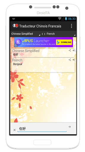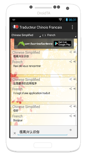 Cette application gratuite est capable de traduire des mots et des textes de l'chinois au français, et du français vers l'chinois. Meilleure application pour les traductions faciles et rapides, qui peuvent être utilisés comme un dictionnaire.