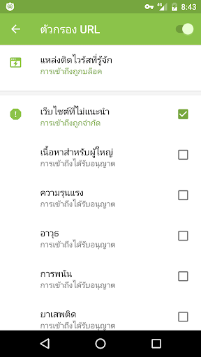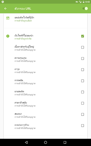 ตัวกรอง Cloud Checker จะจำกัดการเข้าถึงเว็บไซต์อินเตอร์เน็ตที่ไม่เป็นที่ต้องการ บล็อคการเข้าถึงเว็บไซต์ที่อาจเป็นอันตรายหรือไม่แนะนำ ตามที่แบ่งเป็นประเภทต่าง ๆ (ยาเสพติด, ความรุนแรง ฯลฯ)
