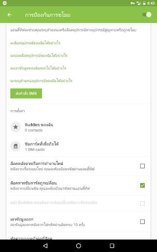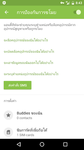 • อนุญาตให้คุณสร้างรายชื่อของหมายเลขโทรศัพท์เพื่อแจ้งการแจ้งเตือนใด ๆ ที่จะถูกส่งออกไป หากบางคนเปลี่ยนซิมการ์ดในอุปกรณ์ที่สูญหาย นอกจากนั้น ยังอนุญาตให้คุณควบคุมการป้องกันการขโมยด้วยการส่งข้อความไปยังอุปกรณ์ จากหมายเลขเหล่านี้ เพื่อปลดล็อคอุปกรณ์หากคุณลืมรหัสผ่านเพื่อปลดล็อค