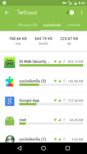• ตัวกรองปริมาณการใช้งานเครือข่ายภายนอกของแอปพลิเคชันที่ติดตั้งไว้บนอุปกรณ์และแอปพลิเคชันของระบบ ให้เลือกระหว่างการกรองเครือข่ายมือถือและWi-Fi จากนั้นให้ใช้ประโยชน์จากกฎที่สามารถกำหนดเองได้ (กรองโดย ไอพีแอดเดรส และ/หรือ พอร์ต และโดยขอบข่ายของเครือข่ายทั้งหมด)