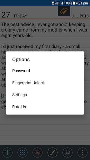 Diary ส่วนบุคคลเป็นแอปไดอารี่ที่ง่ายและใช้งานง่ายที่สุดตอนนี้คุณสามารถติดตามช่วงเวลาที่คุณโปรดปรานในชีวิตของคุณในไดอารี่ดิจิตอลที่ปลอดภัยและเรียบง่ายด้วยไดอารี่ในโทรศัพท์ของคุณ