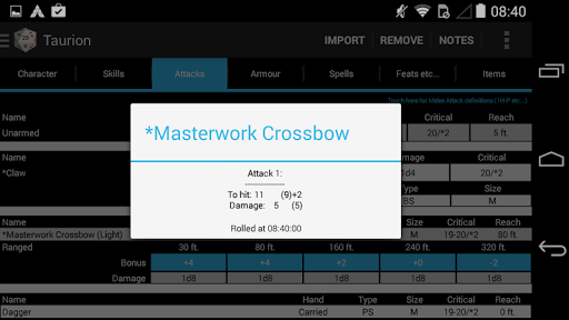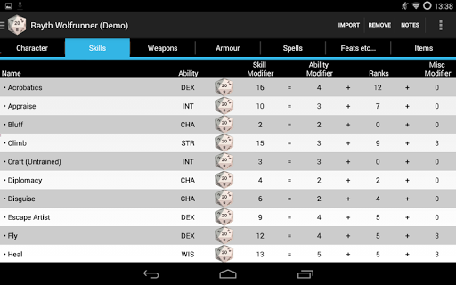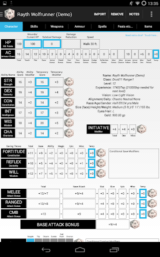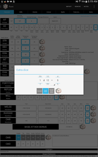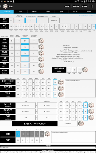 *Conditional Save and Combat modifiers don't appear to actually be exported in the .xml, which is why the boxes will be empty, the boxes are present however to balance out the look and feel of the character sheet, and in preparation in case the information is exported in the future (though an app update would be required to read it).