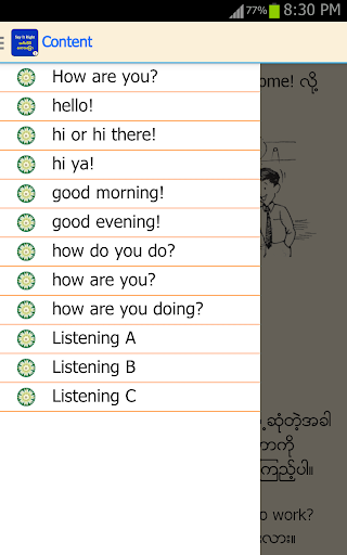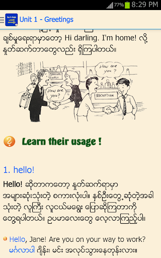 အဂၤလိပ္စကား ေျပာတတ္လိုသူမ်ားအတြက္ စကားေျပာ အသံုးအႏႈန္းမ်ားကို ရွင္းလင္းခ်က္မ်ားႏွင့္ တကြ ေဖာ္ျပေပးထားပါတယ္။ အခန္း တစ္ခုရဲ႕ ေနာက္ဆံုးတြင္ စကားေျပာဆိုၾကပံုမ်ားကို နားေထာင္ႏုိင္မွာျဖစ္ပါတယ္။ ဒီ App ကေလးကေန အဂၤလိပ္စကားေျပာကို ေလ့လာမွတ္သားၿပီး စကားေျပာႏွင့္ နားေထာင္မႈ စြမ္းရည္ တိုးတက္လာႏုိင္ပါေစ။