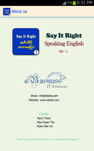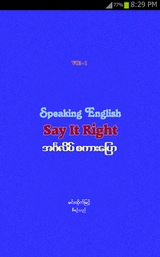 ဒီ Say It Right အဂၤလိပ္ စကားေျပာ Mobile App ကေတာ့ မူရင္းစာအုပ္နဲ႔ CD မွ အေၾကာင္းအရာမ်ားကို ဘာသာျပန္ဆိုထားၿပီး စကားေျပာၾကပံုမ်ားကိုပါ ထည့္သြင္းေပးပါတယ္။ Say It Right စာအုပ္ရဲ႕ ပထမတြဲ ျဖစ္ပါတယ္။