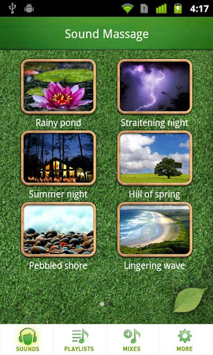 Notice Sound Massage Updates 3 Nature Sounds Added1 Sounds of Animals Canary Couple2 Sounds of Forest The Coming of Spring3 Sounds from Daily Life Cafe in Paris Update to Premium Ver. and Get the Following Benefits 1 No ads in the app2 42 different nature sound themes3 Free access to any future sounds additions amp; updateAre you stressed with all sorts of noises? Do you seek for relaxation and calmness? The answer lies at the nature. The Mother Nature The sound of nature, fill your tired and exhausted heart with fresh energy with Sound Massage. 1F wave relieves your stress Wave and the stream sounds as if the same sounds repeats again and again, but the sound of these natures have a unique rhythm. The professor, MUSHA SUNKO, proved the relaxation effect of this 1F wave rhythm and became a big issue. The sound of nature which gives refreshment by responding to biorhythm has an effect to ease the stress. Japan, Tokyo, Natural science University professor, MUSHA SUNKO Face with Mother Natures sound in the ocean and the forest The forest is where we can open our world of unconsciousness mind and is where it can provide mental freedom while leading potential possibility. Let your body rest in the forest and free yourself. Top japanese cognitive psychologist, TAKASHI TOMITA, the professor of KOMAZAWA University Massage Your Inside We invite you to the world of Sound Massage. Sound Massage is particularly good for these people. People who cannot sleep well due to insomnia Pregnant woman, students, exam applicants who need relaxation People who are stressed much People who want to escape cold city People who want to heal wounded soul People who have stiff emotional ups and downs People who need break People who need mind control People who need to concentrate in short period of time People who need creative idea People who like the ocean, mountain and valley People who loves to travel but cant manage People who want to refresh People who want to start a fresh morning People who want to escape from busy life Effect of sound of nature for each theme Rainfall : It stabilizes our mind and helps to sleep well. Forest : The energetic forest gives refreshment. Wave : Listening waves with closed eyes kicks off the stress. Animal : Beeping of the birds clears our soul. Instrument : Indian flute helps quiet meditation. Life : Moderate life sounds can ease your mind. Punch off your stress and fatigue with Sound Massage