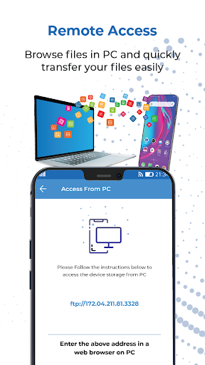 You can access your android device storage from a PC to manage files on your local android device using FTP(File Transfer Protocol). No need to connect by data cable or Bluetooth, Just type the app's given FTP address, Username & Password in your browser and manage all your Android device Folders on your PC with file manager for android.