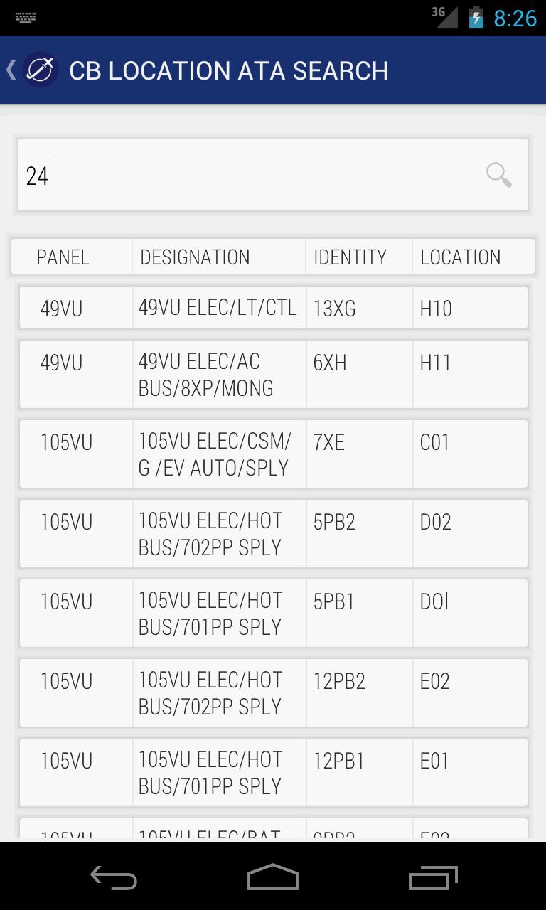 All CB locations & labels can be displayed by name or panel/location. A search function will find all breakers matching a user defined clue. This application is a standalone program enabling riding engineers or working at outstations with considerable ease, as it does not require internet access. The program is designed in way that it can be used also by flight crew in order to reset the CBs.