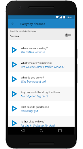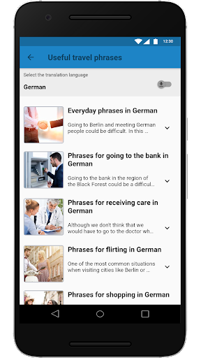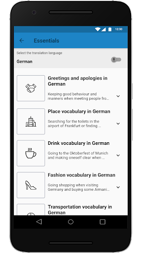 เนื้อหาถูกนำเสนอในสองส่วน: สิ่งจำเป็นและวลีการเดินทางที่มีประโยชน์แต่ละประเภทมีหมวดหมู่ที่แตกต่างกันสำหรับการเดินทางในสิ่งจำเป็นมีคำศัพท์ที่เป็นประโยชน์สำหรับสถานการณ์ประจำวันในขณะที่วลีการเดินทางที่มีประโยชน์มีวลีที่เป็นประโยชน์สำหรับสถานการณ์เฉพาะ