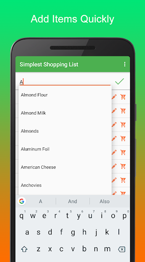 ช่วยให้คุณเพิ่มรายการในรายการช้อปปิ้งของคุณในขั้นตอนน้อยที่สุดเท่าที่จะทำได้ แอพนี้มีวัตถุประสงค์เพื่อแทนที่รายการปากกาและกระดาษที่ง่ายต่อการสูญเสีย หากคุณมีโทรศัพท์ของคุณคุณคุณจะมีรายการของรายการช็อปปิ้งร้านขายของชำหรือสิ่งอื่น ๆ ที่คุณต้องซื้อ แอพนี้มาพร้อมกับการเติมข้อความอัตโนมัติที่ชาญฉลาดซึ่งทำให้การเพิ่มรายการลงในรายการนั้นรวดเร็วสุด นอกจากนี้ยังเรียนรู้รายการใหม่ที่ฉันไม่ได้กำหนดไว้ล่วงหน้าดังนั้นเมื่อถึงเวลาที่จะได้รับการปรับแต่งโดยเฉพาะสำหรับความต้องการในการซื้อของคุณ