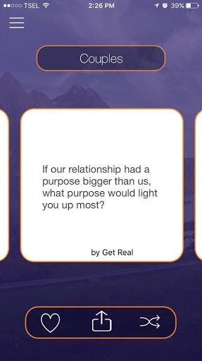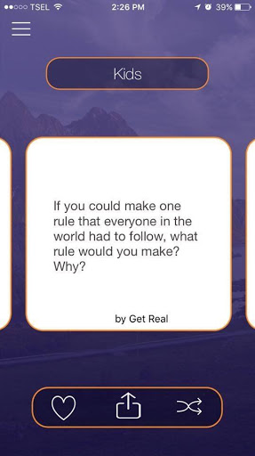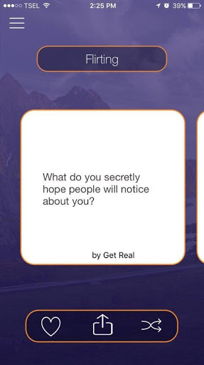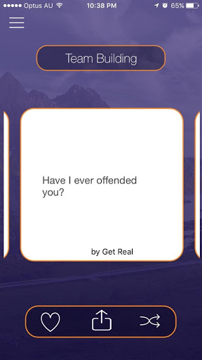 Great ice-breakers, conversation starters, flirting and dating questions. Amazing for team building, families, teachers and classrooms. WAY more than 36 questions, and way deeper. More authenticity, rapport and intimacy. Say NO to small-talk! :-) Get Real is a wonderful dating app, classroom or teaching app, party app, and team building app.