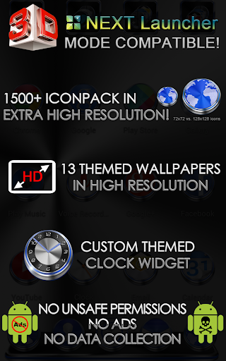 ธีมตัวเปิดถัดไป 3D ธีมตัวเรียกใช้งานรายละเอียดที่มีรายละเอียดและคุณภาพสูงที่มีคุณภาพสูงและทันสมัยพร้อมกราฟิกความละเอียดสูงรวมถึง 1500 แพ็คของไอคอนขนาดพิเศษ 128x128 ขนาด 13 วอลเปเปอร์ HD ที่กำหนดเองและวิดเจ็ตนาฬิกาโลหะเพื่อให้กราฟิกที่มีรายละเอียดและกำหนดมากแม้ในอุปกรณ์ที่มีระดับสูงสุด หน้าจอความละเอียด ทุกอย่างเป็นธีมในรายละเอียดสุดท้ายโดยใช้พื้นผิวโลหะเอฟเฟกต์แสงสะท้อนแสงสะท้อนและการไล่ระดับสีเพื่อให้ความคมชัดและดูคุณภาพที่ยอดเยี่ยม