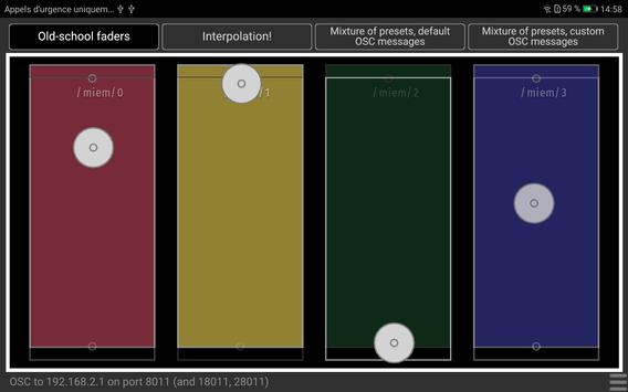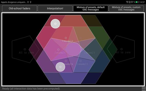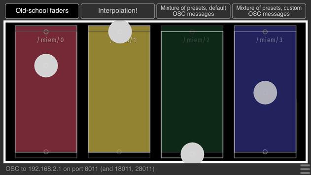 MIEM Play is an innovative OSC controller app for touch interfaces. Based on your favorite presets, it allows you to create, interpolate and discover new presets from touch interactions with shapes on the screen.
