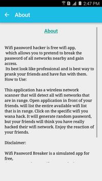Wifi Password Breaker is a simulated app for free, it cannot crack any wifi password. The simulation of password cracking is just for fun.