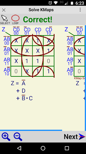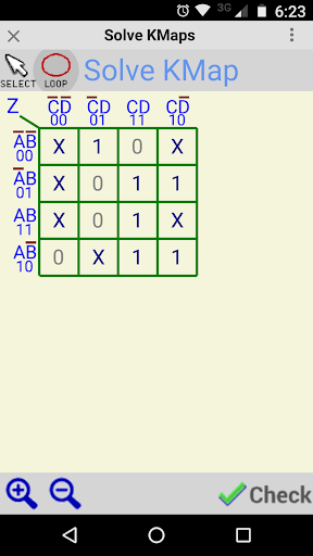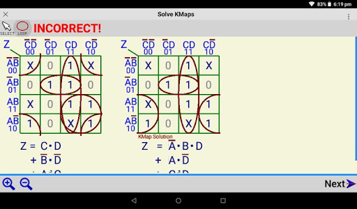 แอปพลิเคชันแสดง KMAP ที่ยังไม่ได้แก้ไขซึ่งผู้ใช้จะแก้ปัญหาโดยการวนรอบตรรกะสูง (1) และ / หรือ don ' t cares (x)เมื่อผู้ใช้แก้ไข KMAP เสร็จแล้วปุ่มตรวจสอบจะตรวจสอบโซลูชันและให้ข้อความที่ถูกต้องหรือไม่ถูกต้องจากนั้นแอปพลิเคชันจะแสดง KMAP ที่แก้ไขแล้วที่ถูกต้องข้าง KMAP ที่ผู้ใช้แก้ไขตัวเลือกช่วยให้ผู้ใช้สามารถเลือกโซลูชันที่เล็กที่สุดที่เทียบเท่ากันได้หลายรายการสำหรับแผนที่ Karnaugh