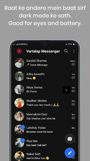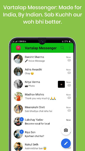 Vartalap Indian Messenger สามารถใช้เป็นแอพโทรวิดีโอได้การโทรวิดีโอมีความชัดเจนมากมันเป็นหนึ่งในประสบการณ์การโทรวิดีโอที่ดีที่สุดVartalap เป็นผู้ส่งสารแชท Swadeshi อินเดีย