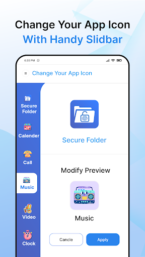 ไอคอนปลอมตัว: ไอคอนของแอปพลิเคชันดูเหมือนโฟลเดอร์ที่ปลอดภัยของระบบธรรมดาและคุณยังสามารถเปลี่ยนไอคอนที่แตกต่างกันแทนไอคอนแอพดั้งเดิมที่คุณสามารถทำได้จากหลักการตั้งค่าหน้าจอเป็นตัวเลือกแบบเลื่อนลงคุณสามารถเปลี่ยนเป็นไอคอนแอพนาฬิกาไอคอนข้อความล็อคเครื่องคิดเลขไอคอนสภาพอากาศ